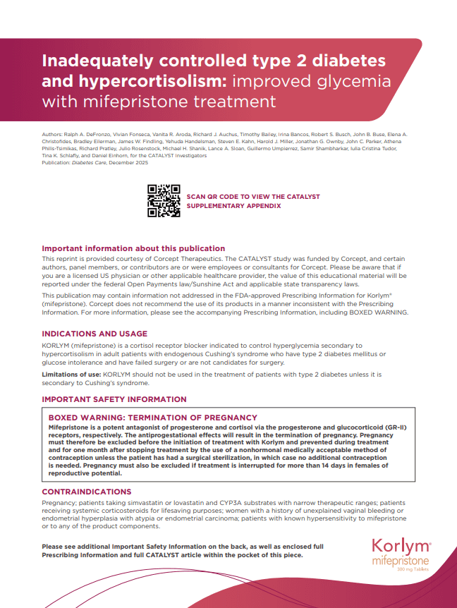 The US-KOR-26-0012 01-26 HCP Korlym CATALYST Reprint Carrier is designed to house the DeFronzo 2025 "Inadequately controlled type 2 diabetes and hypercortisolism: improved glycemia with mifepristone treatment" Reprint.