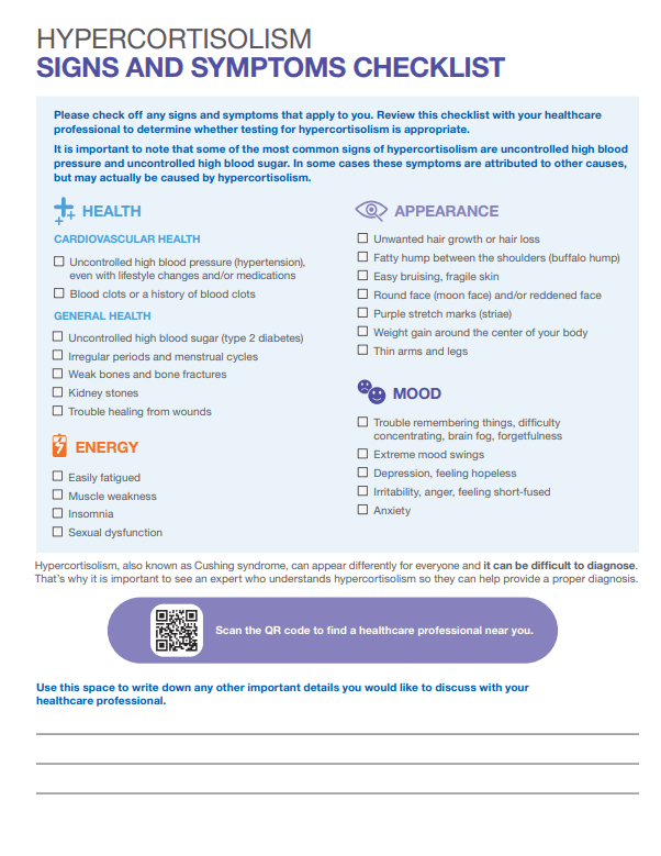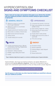 Screening resource for patients to complete and discuss with their HCP if testing may be appropriate based on their symptoms. Includes overview on understanding the function of cortisol, what causes hypercortisolism and how to test.