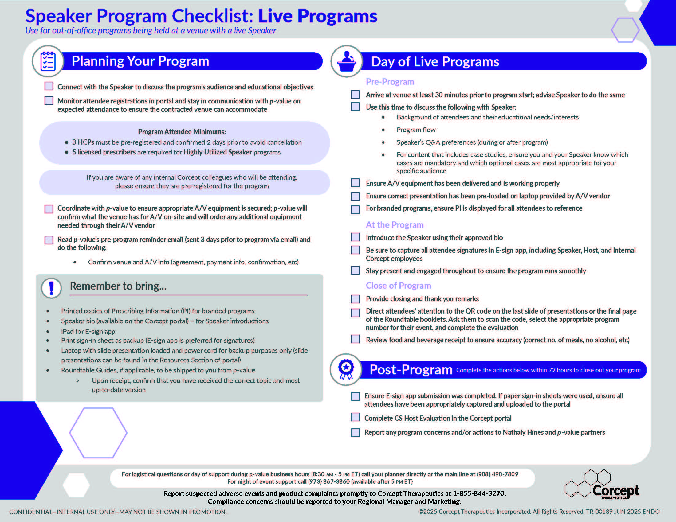 Speaker bureau checklist used to aid program hosts on planning, hosting, and post program responsibilities for Live In-Venue programs. These will be emailed by p-value to program hosts along with the program confirmations as a reminder of all the things that program hosts should be considering when planning live programs.